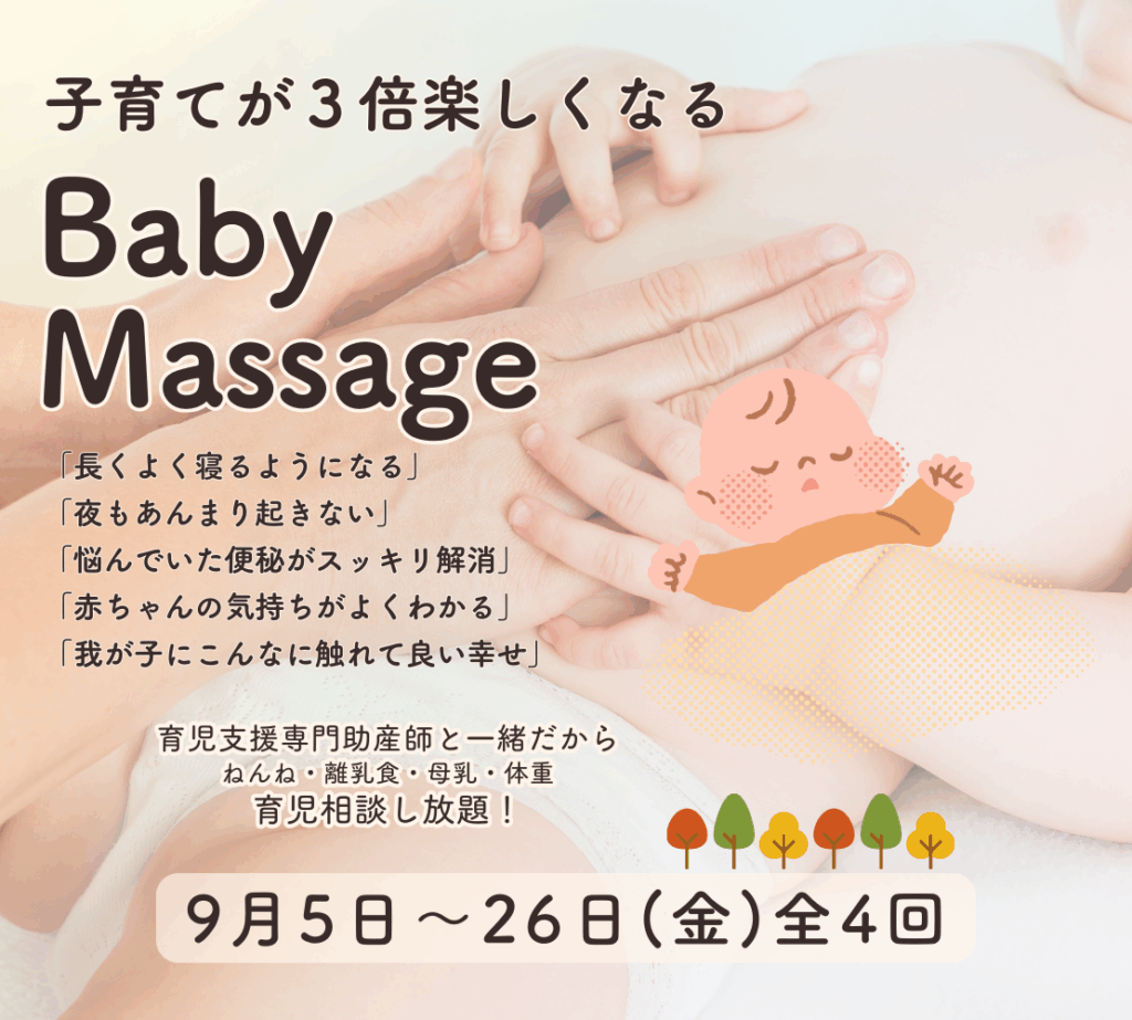 | 内容 | 100%植物オイルを使用して赤ちゃんの全身マッサージ、赤ちゃん体操、体重測定、育児相談 |
