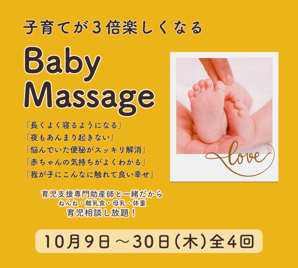 | 内容 | 100%植物オイルを使用して赤ちゃんの全身マッサージ、赤ちゃん体操、体重測定、育児相談 |